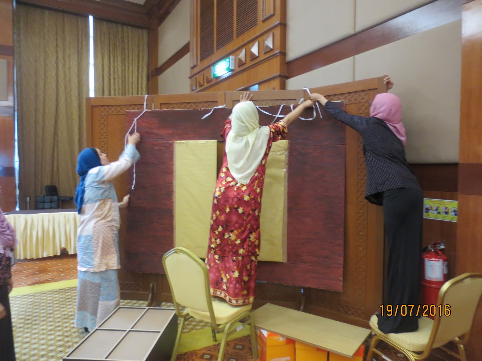 Hasil kerjasama semua orang macam-macam props kami sediakan. Ketupat reben mana yang rajin menganyam hah dapat sebakul. Dr Sara pulak dalam diam-diam rupanya pandai melukis. Nanti aku tunjukan lukisan Dr Sara. Cantik walaupun meniru kartun Kampung boy.